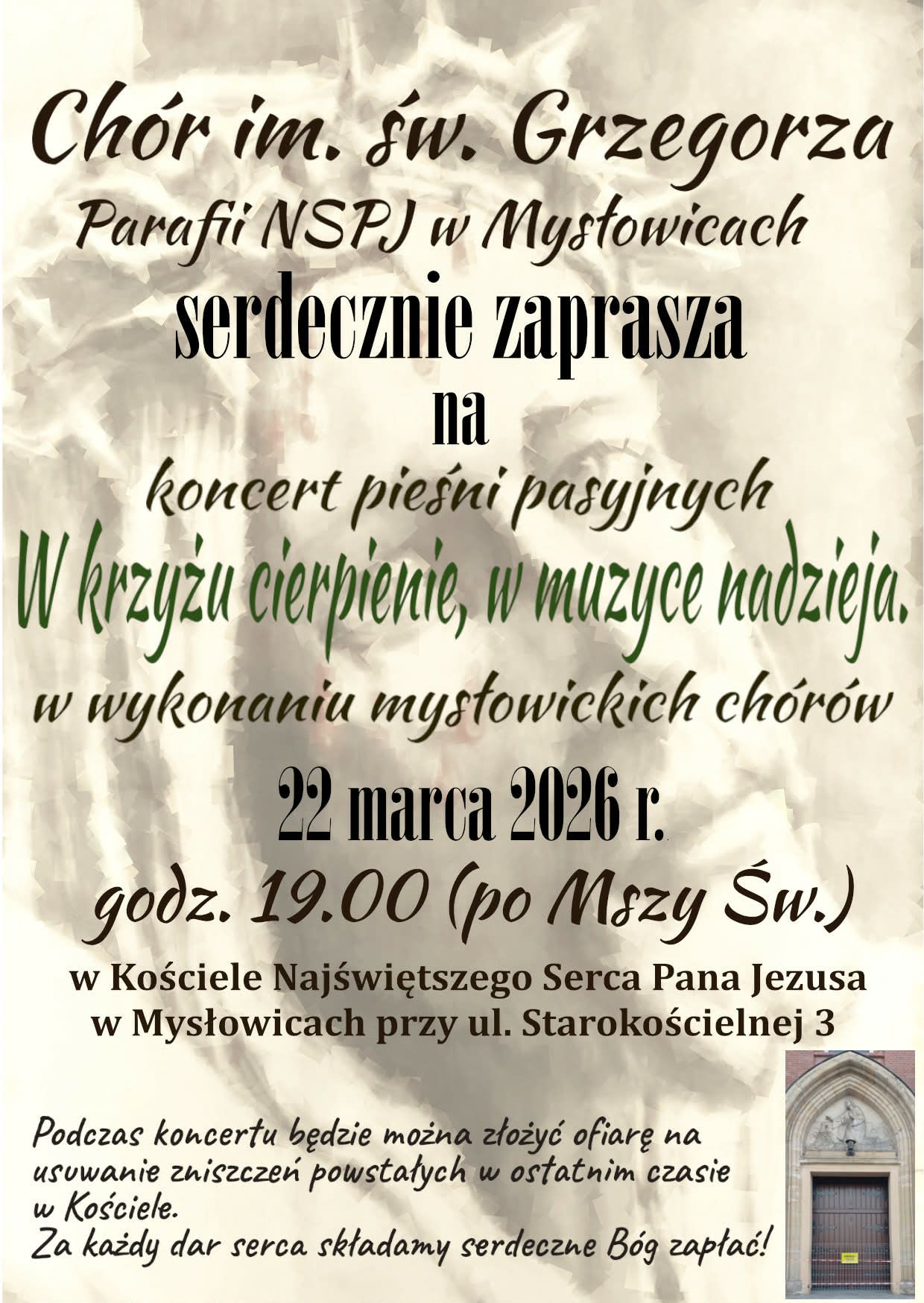 W niedzielę 22 marca o godzinie 19.00 serdecznie zapraszamy wszystkich parafian i gości na koncert pieśni pasyjnych. Wydarzenie to będzie nie tylko okazją do wielkopostnej zadumy, ale także formą wsparcia dla naszej wspólnoty